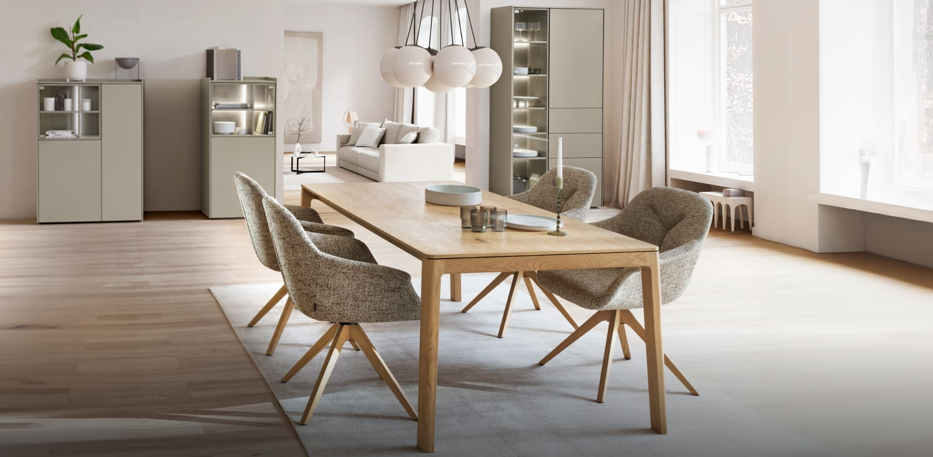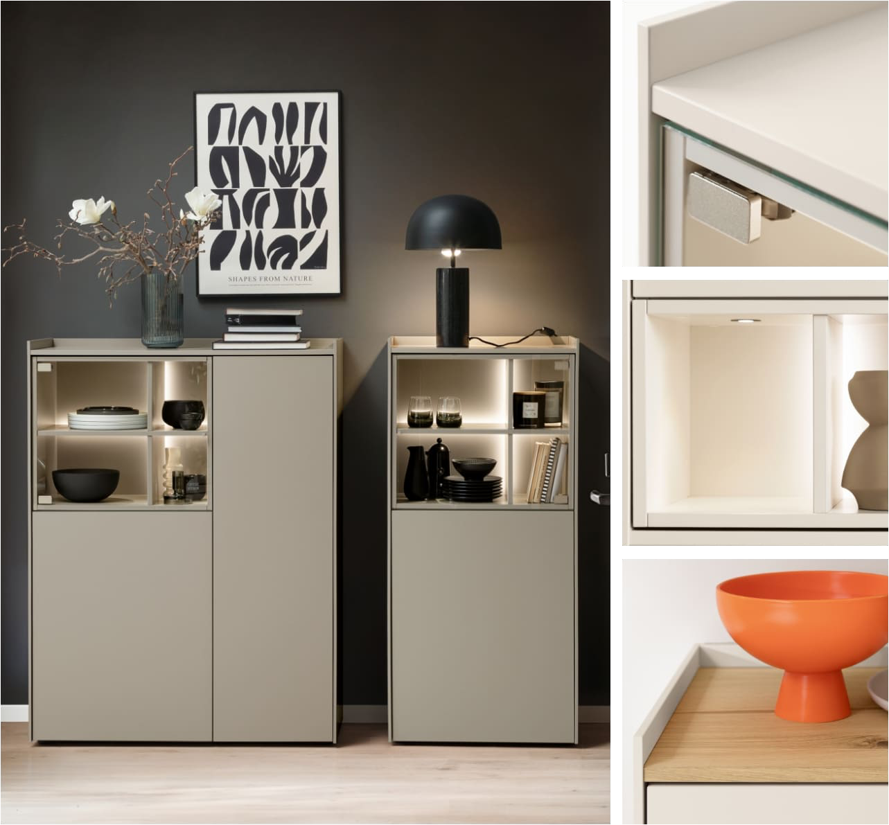 Offen für Ordnung – im richtigen Licht. ATENO schafft Stauraum genau dort, wo Sie ihn brauchen und hält dabei die Balance zwischen Präsentation und Reduktion. Mit Highboards und Vitrinen, die Dekoratives voller Leichtigkeit inszenieren. Von Rückwand-Beleuchtung bis hin zu Einbaustrahlern: Bei ATENO nutzen Sie Licht als Werkzeug, das Tiefe schafft und Räume beruhigt.