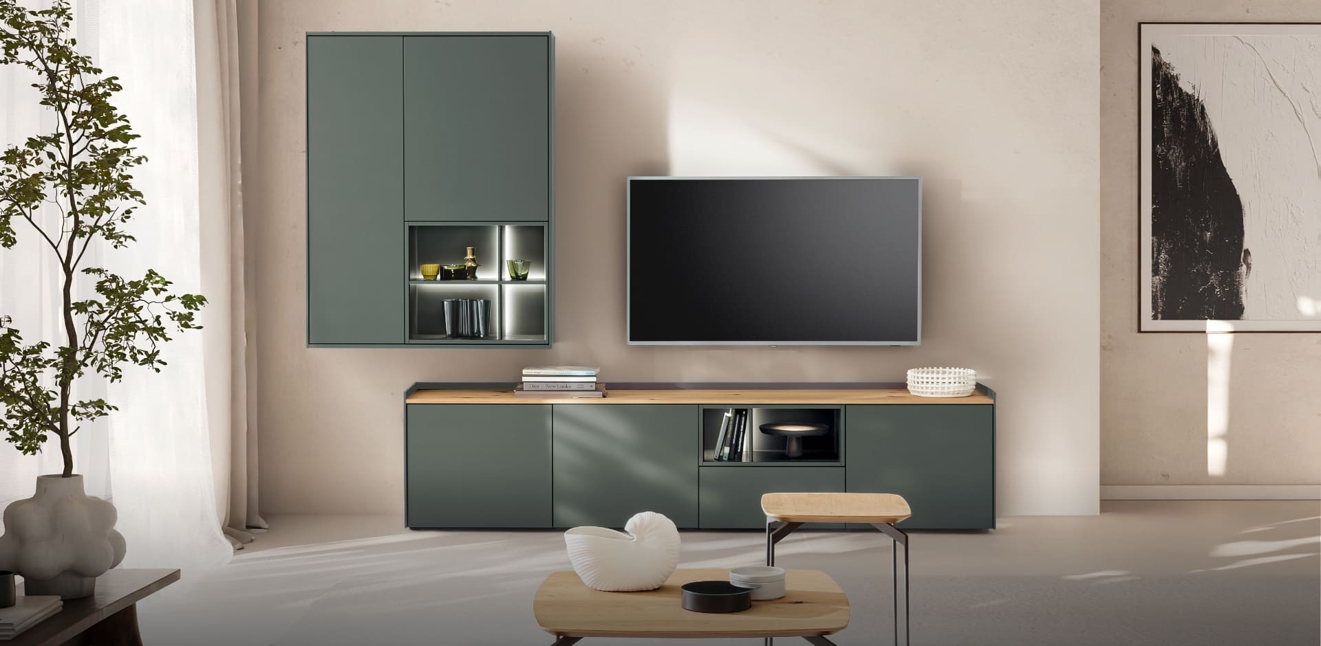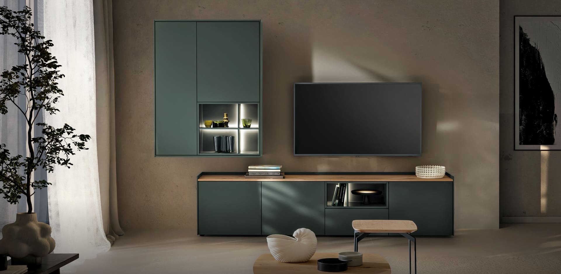Offen für Ordnung – im richtigen Licht. ATENO schafft Stauraum genau dort, wo Sie ihn brauchen und hält dabei die Balance zwischen Präsentation und Reduktion. Mit Highboards und Vitrinen, die Dekoratives voller Leichtigkeit inszenieren.Von Rückwand-Beleuchtung bis hin zu Einbaustrahlern: Bei ATENO nutzen Sie Licht als Werkzeug, das Tiefe schafft und Räume beruhigt.